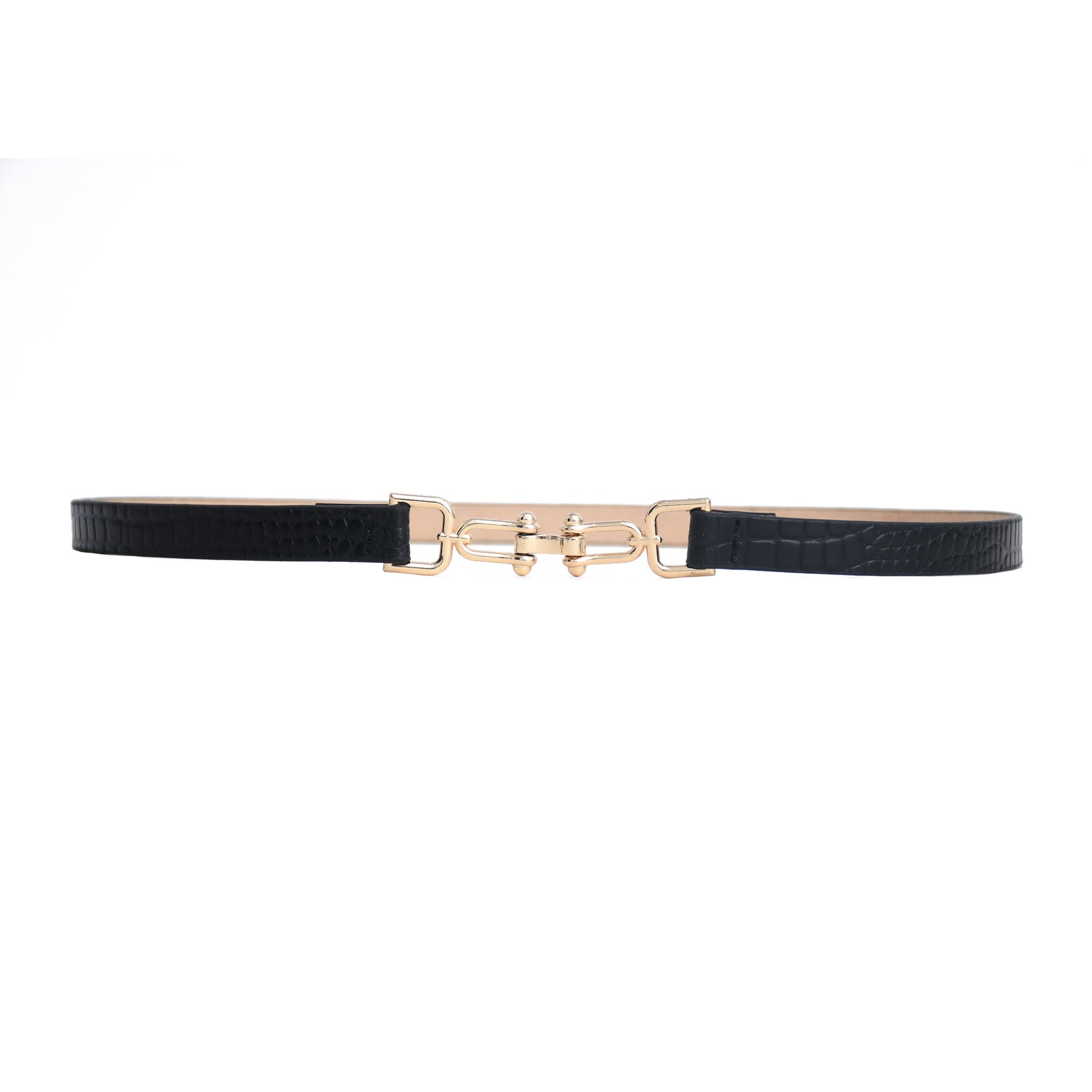Its standout feature is the polished gold-tone clasp closure, which brings a sophisticated jewelry-inspired touch to the design. Combined with the slim silhouette and smooth leather lining, this belt feels both contemporary and versatile, making it ideal for dresses, blazers, high-waisted trousers, and polished everyday styling.