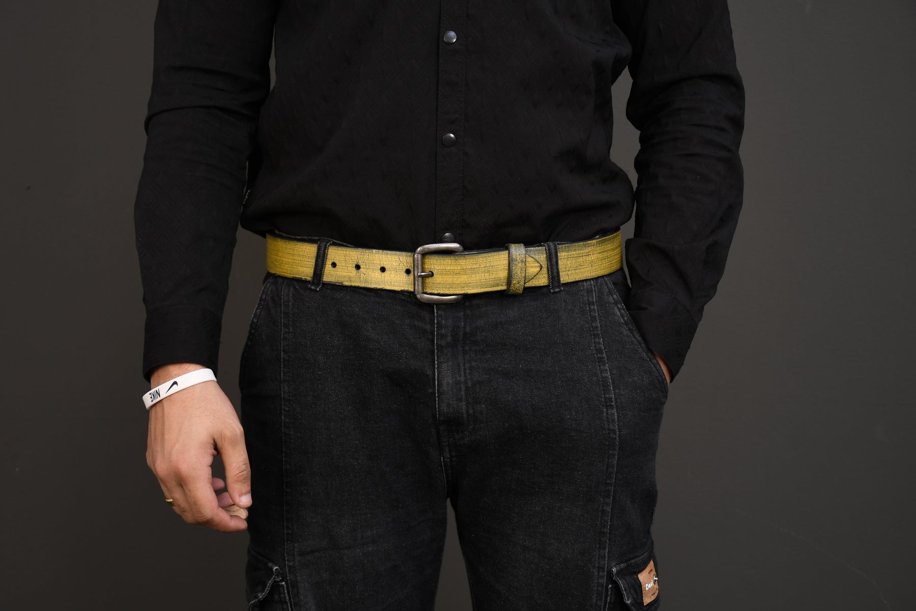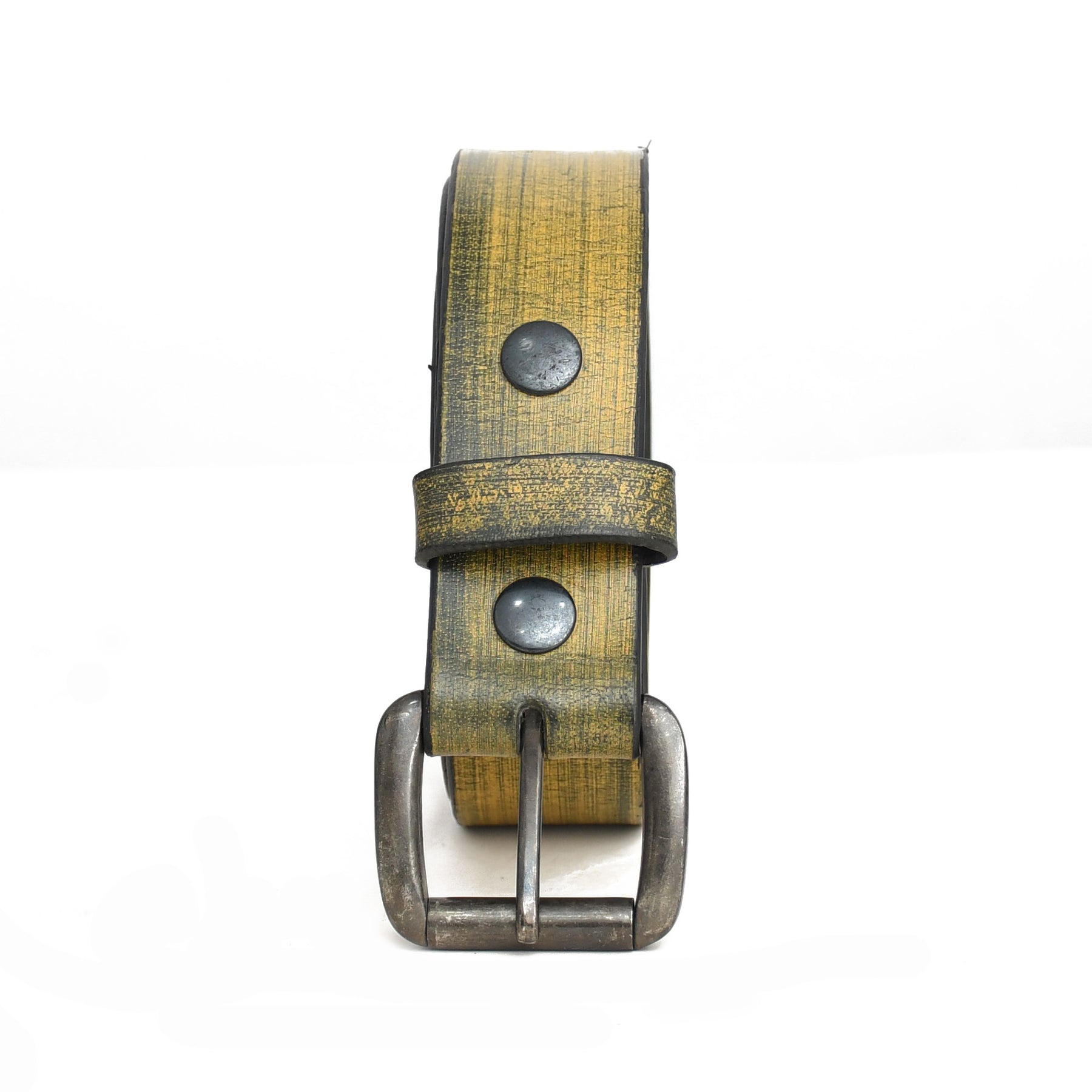 Make a statement with a belt that looks like nothing else. This handmade genuine leather belt features a distinctive distressed olive-gold genuine leather finish with a brushed, textured grain that feels bold, modern, and premium. The surface has an intentionally worn-in character—designed to look elevated from day one, not flat or ordinary.