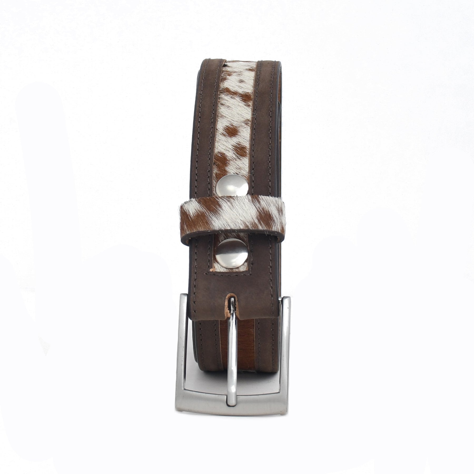 Finished with polished metal rivets and a sleek silver-tone buckle, this premium handmade genuine leather cow hair belt delivers both strength and style. The combination of natural cow hair texture and premium leather construction creates a distinctive accessory for modern wardrobes.