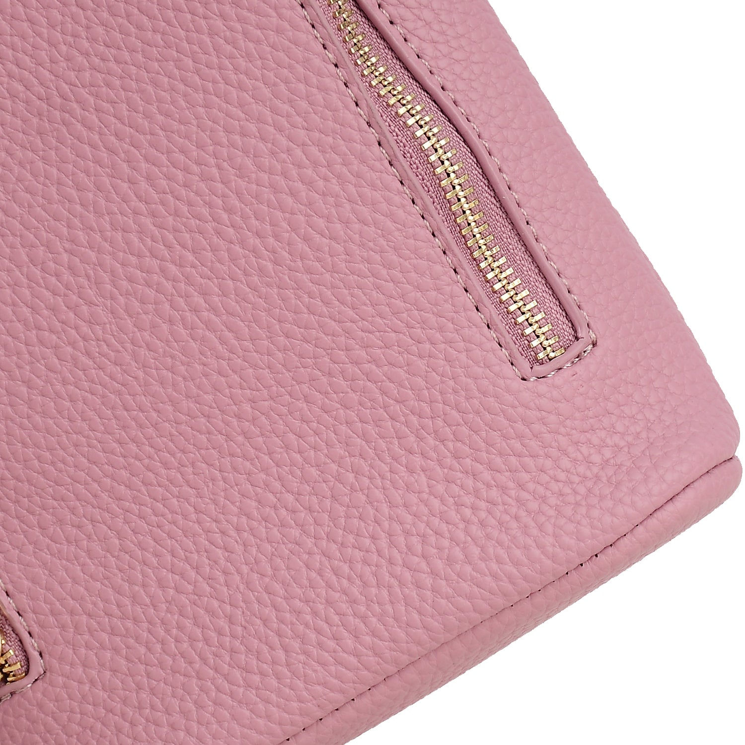 Close-up of a pink leather handbag with a gold zipper.