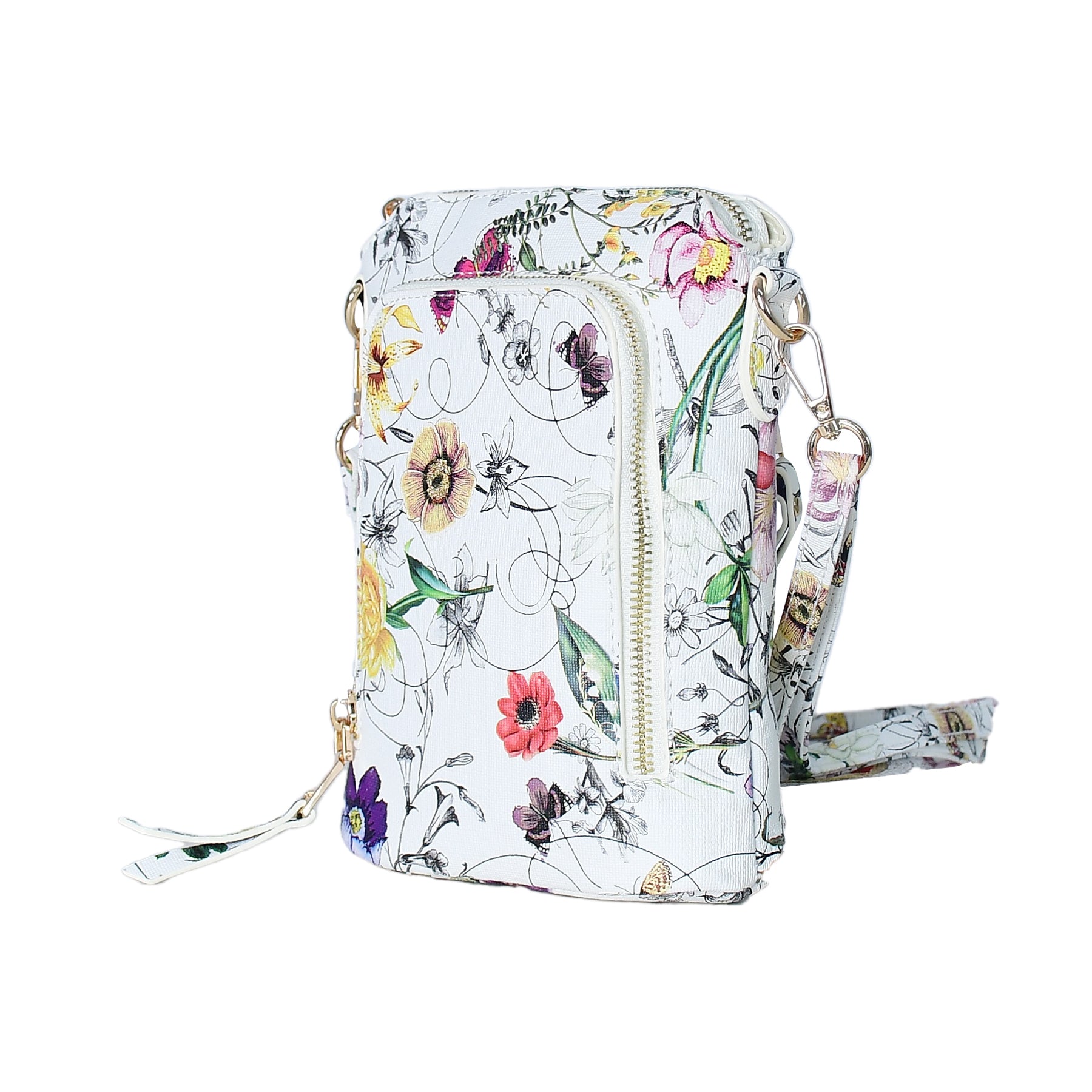 Floral patterned crossbody bag on a white background