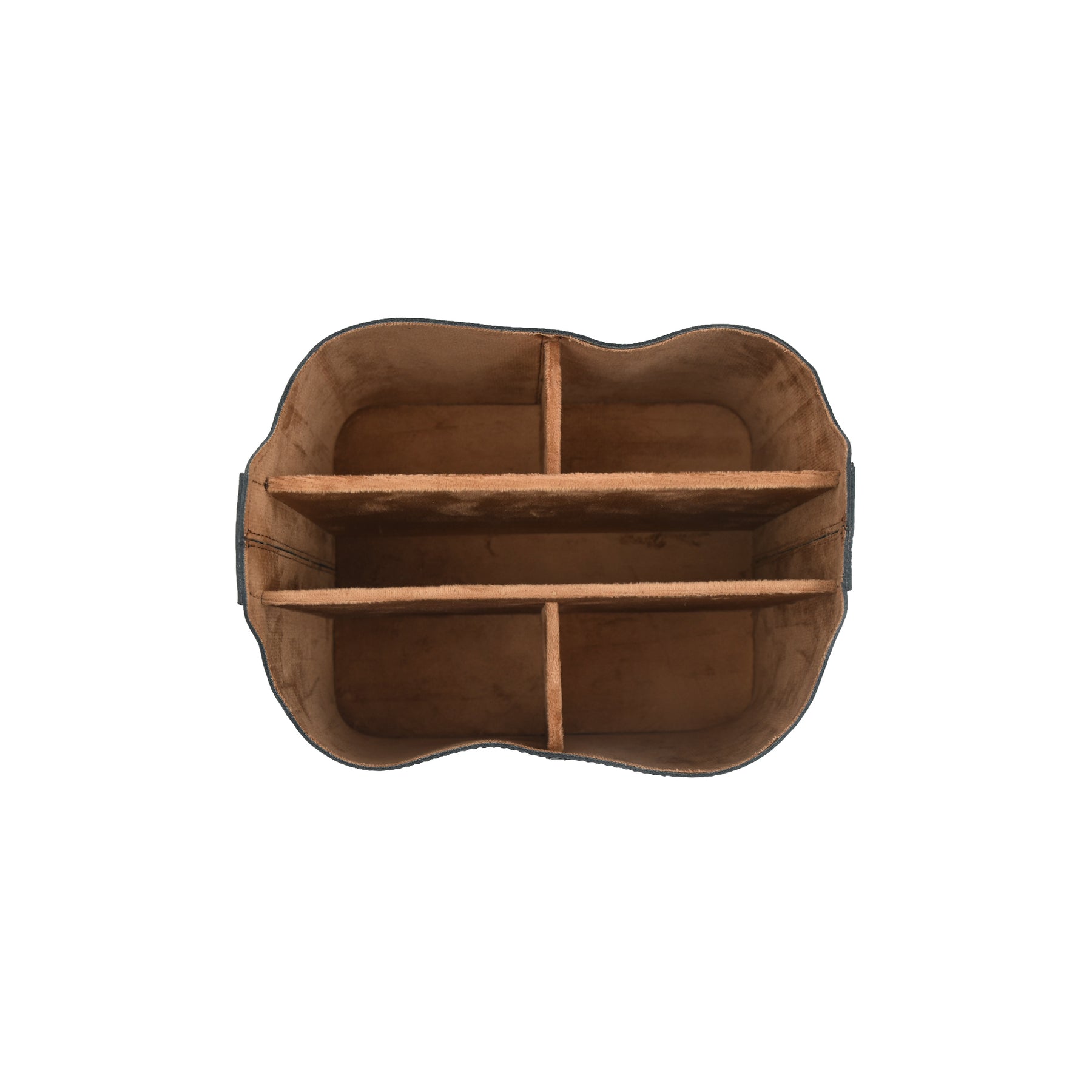 Brown leather storage organizer with beige interior on a white background