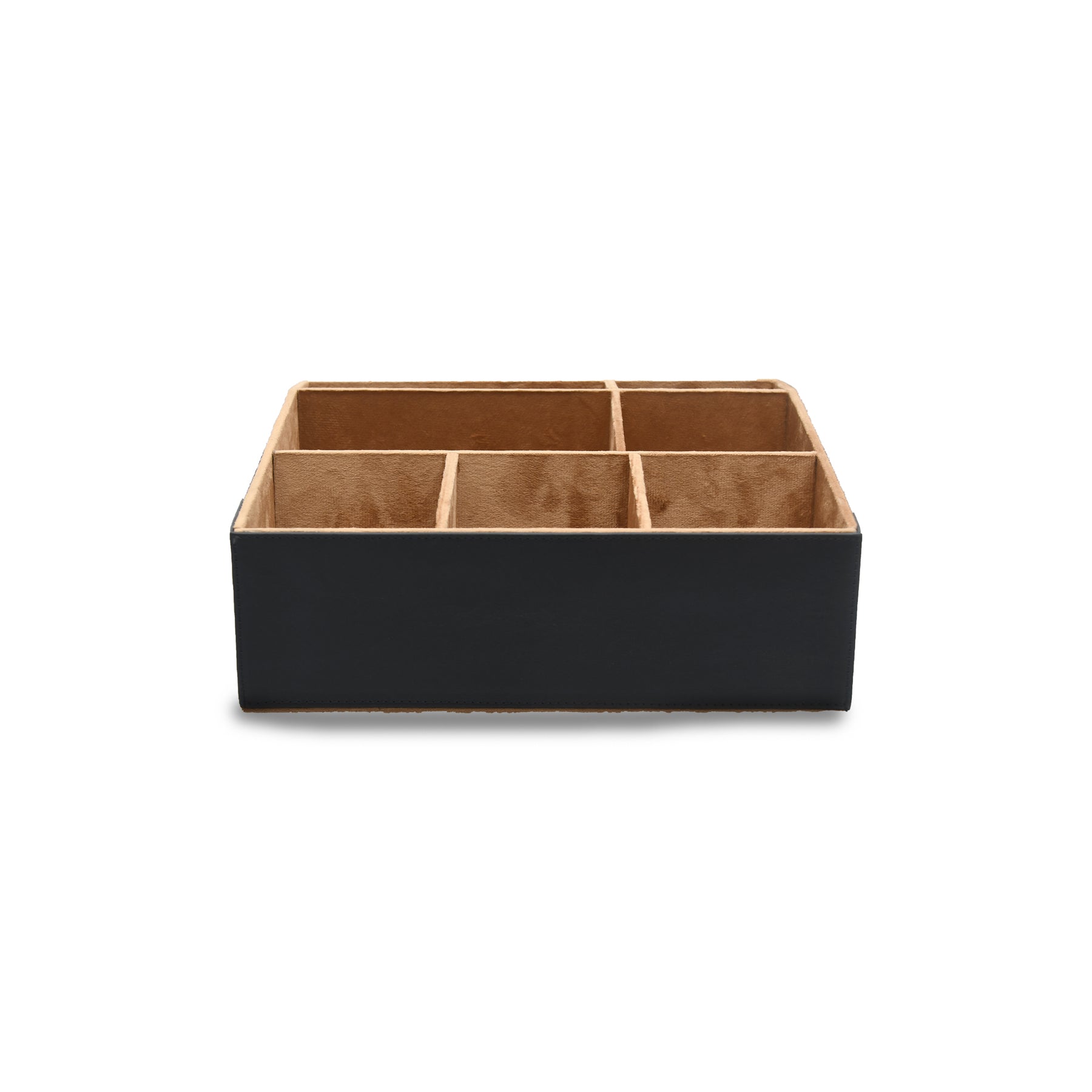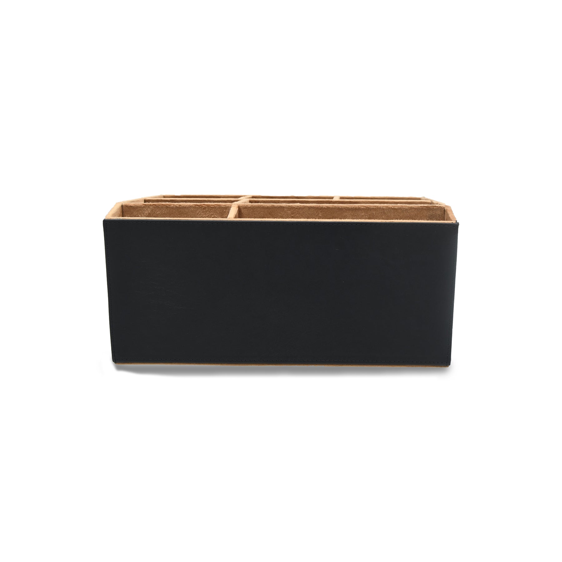 Black and leather compartmentalized storage organizer on a white background