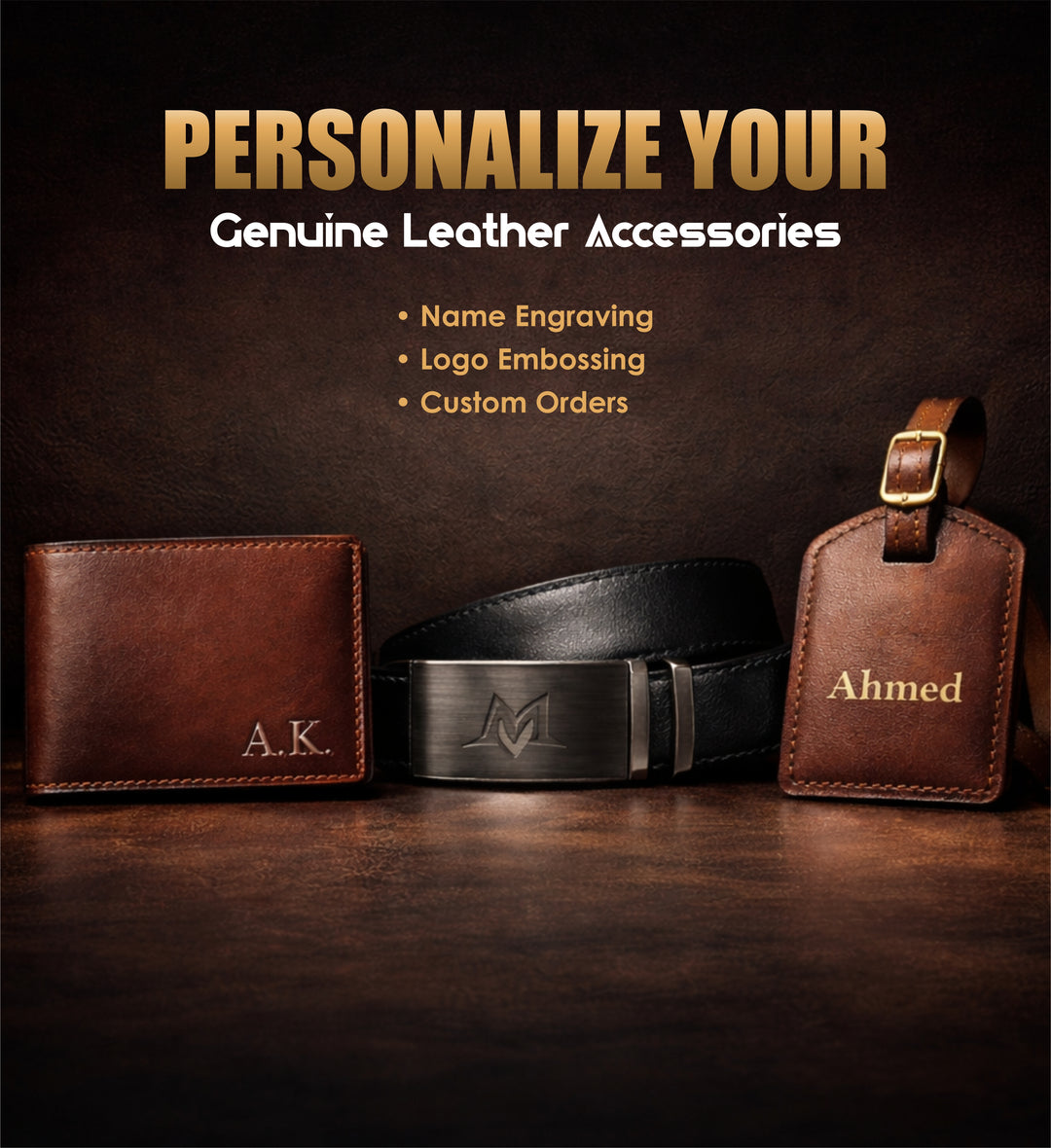 Personalize your leather pieces with custom engraving and branding. Designed to make every product uniquely yours with a touch of individuality and class.